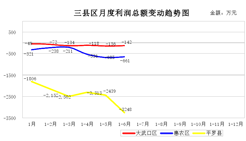 6月末,县(区)26户国有企业盈亏相抵累计亏损4,051万元,同比增亏1,564万元、增亏63%。其中:大武口区盈亏相抵累计亏损142万元,同比减亏123万元、减亏46%;惠农区盈亏相抵累计亏损661万元,同比减利增亏897万元;平罗县盈亏相抵累计亏损3,248万元,同比增亏790万元、增亏32%。