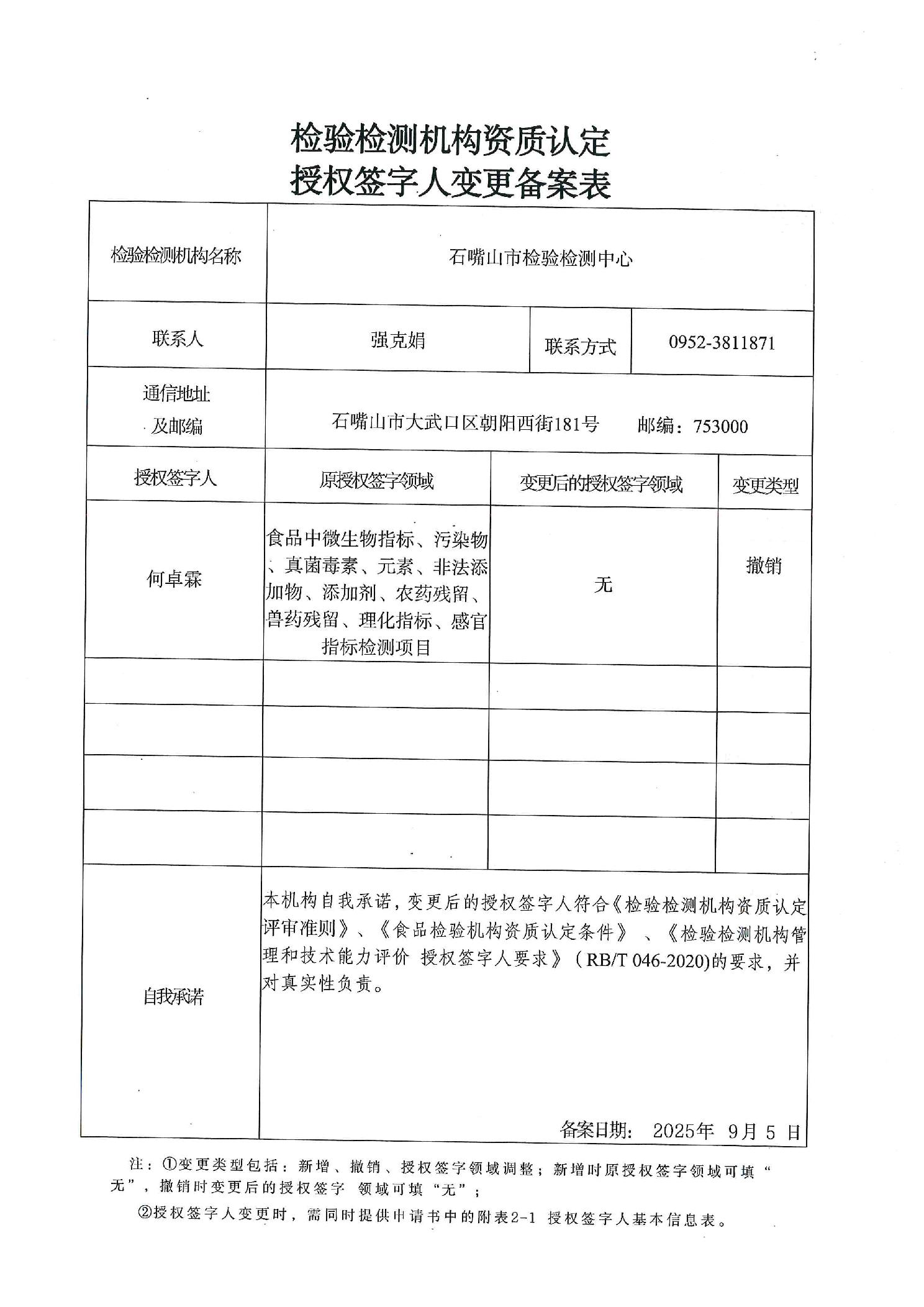 检验检测机构资质认定授权签字人变更备案表