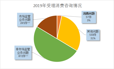 2019年度,全市12315热线共受理消费者咨询1744件,同比增长15.19%。其中:消费问题57件,占咨询总量的3.27%。其他问题和非市场监管业务为530件和872件,占咨询总量的80.39%;市场监管业务285件,占咨询总量的16.34%。