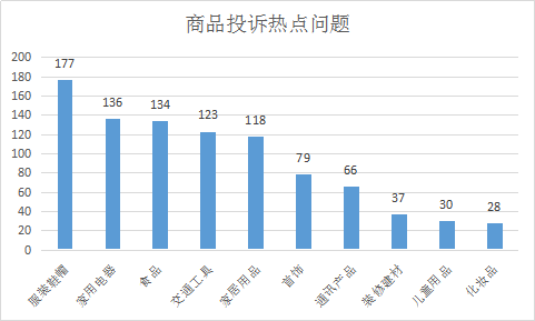 (1)服装鞋帽类商品投诉仍居榜首。服装鞋帽177件,占商品类投诉量的10.53%,同比增长39.70%。集中反映服装掉色、脱线、缩水、起包、起球等;鞋类开胶、掉皮、掉色、装饰物脱落等质量问题;经营者售后服务意识薄弱,重销售轻服务,不积极处理售后问题,敷衍推脱,冷漠消极,只换修,难退货。能达到退货和免费修理条件的,不积极落实“三包”,规避责任,从而引发投诉。