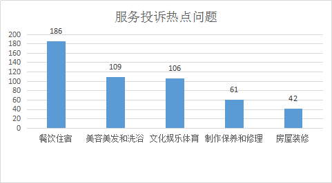 2.服务类投诉情况分析。2019年,共受理服务类投诉936件,占投诉总量的30.73%,其中排名前五位的分别为:餐饮和住宿服务186件,美容美发和洗浴服务109件、文化娱乐体育服务106件、制作、保养和修理服务61件、房屋装修服务42件。分别占服务类投诉总量的19.87%、11.65%、11.32%、6.52%和4.49%。