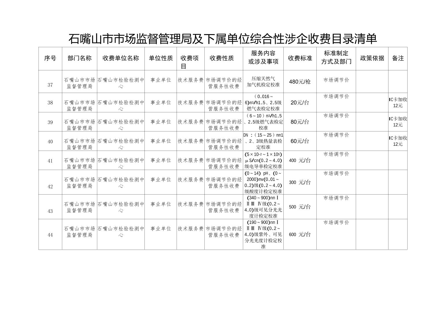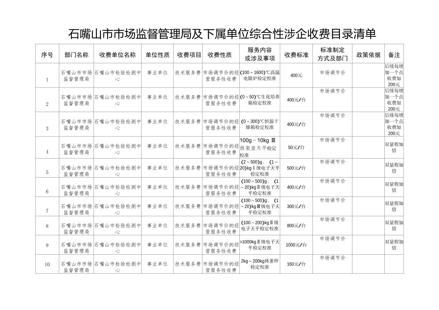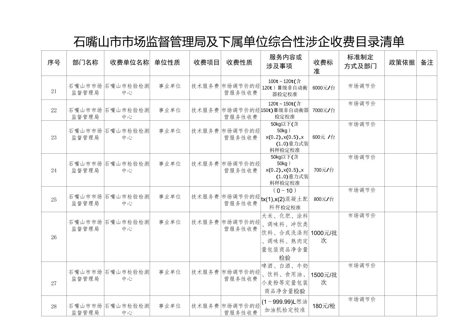 石嘴山市市场监督管理局及下属单位综合性涉企收费目录清单(计量收费目录)