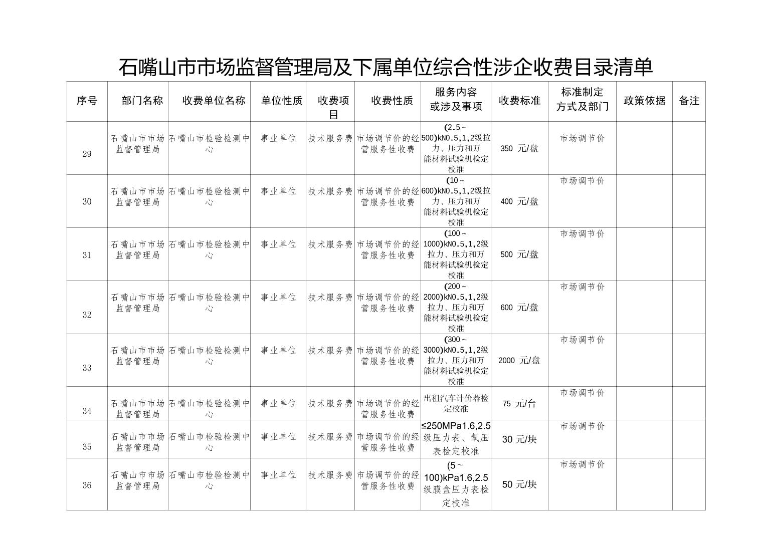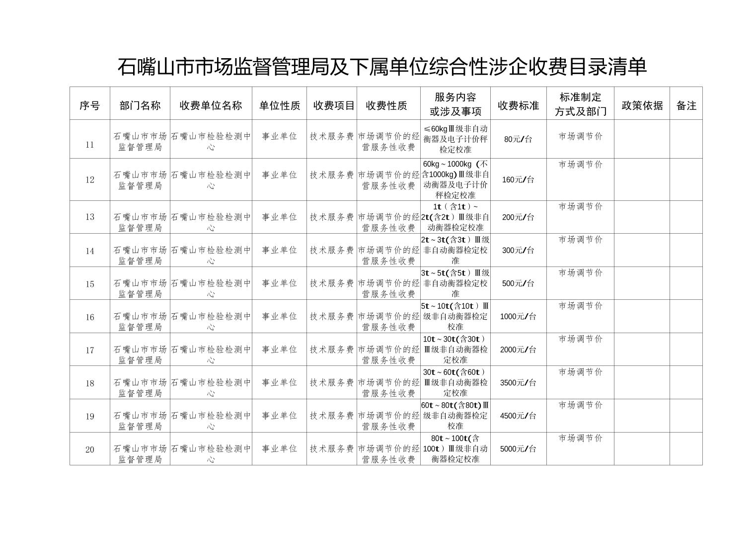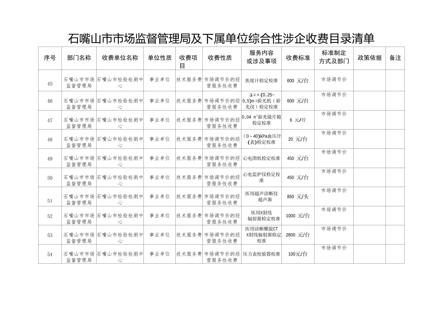 石嘴山市市场监督管理局及下属单位综合性涉企收费目录清单(计量收费目录)