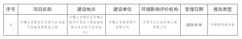 石嘴山市生态环境局2025年8月18日受理建设项目环境影响评价文件情况的公示