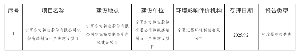 石嘴山市生态环境局2025年9月2日受理建设项目环境影响评价文件情况的公示