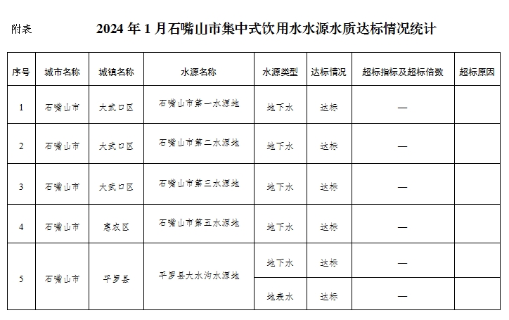2024年1月,石嘴山市共监测5个集中式生活饮用水水源,分别为石嘴山市第一、第二、第三、第五水源地和平罗县大水沟水源地(地表、地下混合型)。