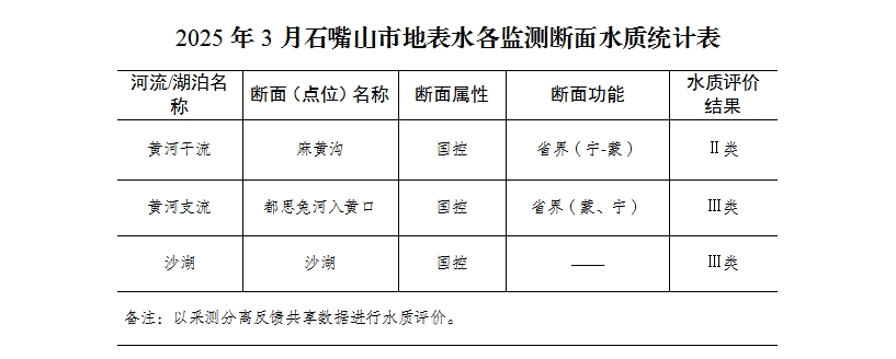 2025年3月,黄河干流石嘴山出境麻黄沟断面为Ⅱ类优水质,黄河支流都思兔河入黄口断面扣除氟化物后为Ⅲ类良好水质。