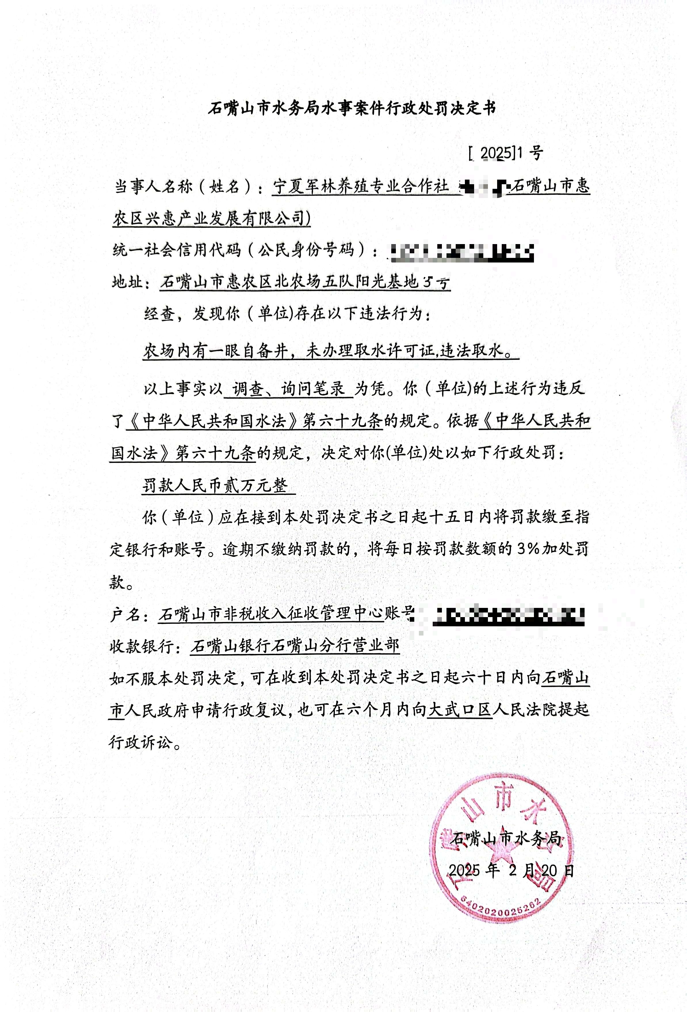 石嘴山市水务局水事案件行政处罚决定书