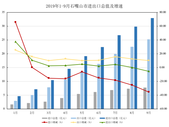 1-9月份,我市实现进出口总值32.98亿元,同比下降5.37%,占全区进出口总值的18.46%。其中,进口7.75亿元,同比下降35.27%,出口25.23亿元,同比增长10.28%。净出口值17.48亿元,增长58.13%。主要呈现以下特点: