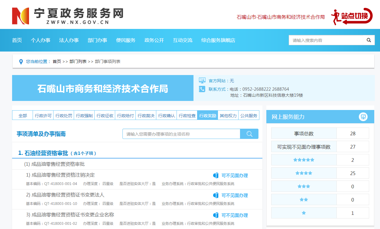 深入学习贯彻自治区、市关于“互联网+政务服务”及“不见面、马上办”的部署和要求,在局网站设置“网上办事”链接,可直接访问市商务局在“宁夏政务服务网”开设的办事页面。加强不见面审批事项梳理,市商务局现有的28项行政事项中有27项时限“不见面审批”,其中2项实现“全程网办”。市商务局及时将所有事项的流程、要求等各要素在办事页面进行公开,为企业办事提供便利。同时,在局网站设立“权力清单”“责任清单”专栏,根据权力清单动态调整情况对局权力清单进行了重新发布。