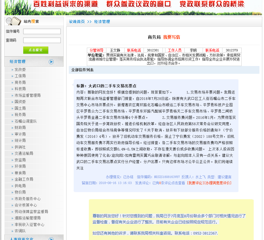 今年以来,市商务局累计收到议政网来信7篇、局网站领导信箱来信1篇,均按照要求在规定时间进行了答复。