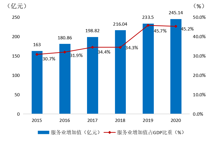 经济贡献日益突出。“十三五”时期,服务业对全市深化供给侧结构性改革、持续扩大就业、拉动经济增长、提升居民幸福感等方面贡献突出,成为全市经济增长的重要引擎、惠民生的主渠道和新增就业的容纳器。2020年,现代服务业实现增加值245.1亿元,占地区生产总值比重为45.2%,比2015年提高1.1个百分点,对经济增长贡献率为39.2%,完成税收占全部税收比重达35%。