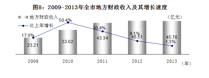 全年实现地方财政收入45.76亿元,比上年下降1.3%,其中:增值税4.18亿元,下降8.8%;营业税8.48亿元,增长2.7%;企业所得税1.88亿元,增长22.1%。全年地方财政支出102.44亿元,比上年增长5.9%,其中:一般公共服务支出7.17亿元,增长15.5%;教育支出10.90亿元,下降11.6%;科学技术支出0.71亿元,增长81.3%;社会保障和就业支出8.05亿元,增长7.3%;医疗卫生支出5.45亿元,增长12.2%;环境保护支出4.53亿元,增长11.6%;农林水事务支出10.54亿元,增长23.6%。