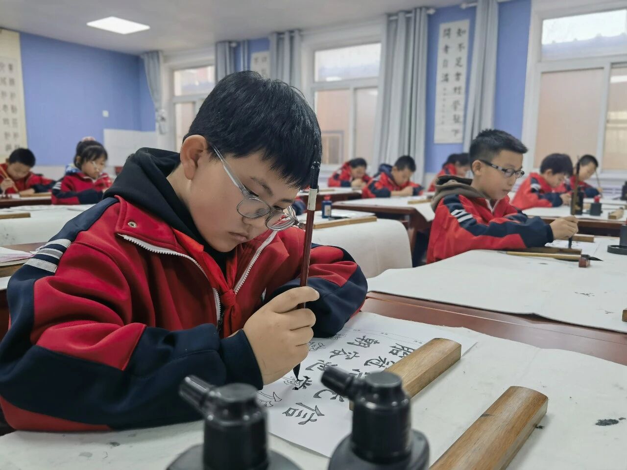 在石嘴山市第十三小学书法教室,学生正在练习毛笔字。
